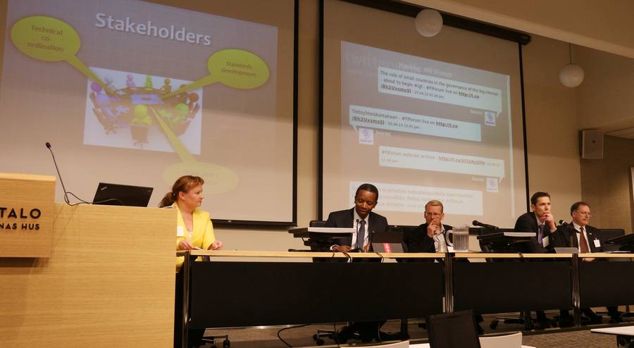 Mervi Kultamaa ulkoministeriöstä johti illan viimeistä paneelia, jossa pohdittiin englanniksi pienten maiden roolia suuren Internetin hallinnassa. Paneelissa Chengetai Masango Internet Governance Forum -järjestöstä (IGF), Dan Daley Yhdysvaltain Helsingin-suurlähetystöstä, kansanedustaja Sinuhe Wallinheimo Jyväskylästä sekä Internet Engineering Task Force -järjestön puheenjohtaja Jari Arkko.