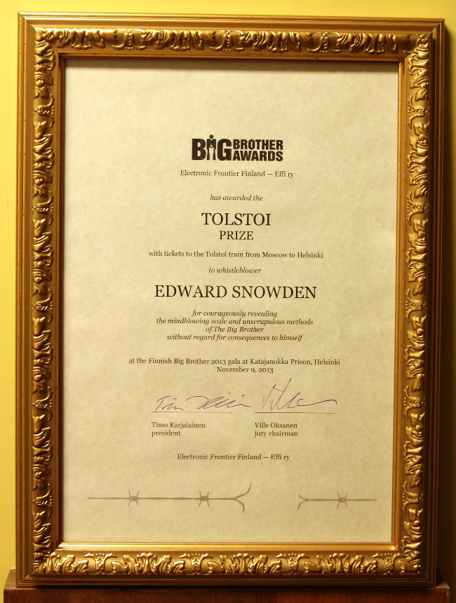 Toinen palkinto jaettiin erityisenä Tolstoi-palkintona Edward Snowdenille. Tolstoi-palkintoon sisältyy junalippu Tolstoi-junaan Moskovasta Helsinkiin. Snowdenkin palkittiin paljastuksistaan, jotka osoittivat Yhdysvaltojen ja muiden maiden tiedustelupalvelujen härskin vakoilun ja salakuuntelun todellisen laajuuden.